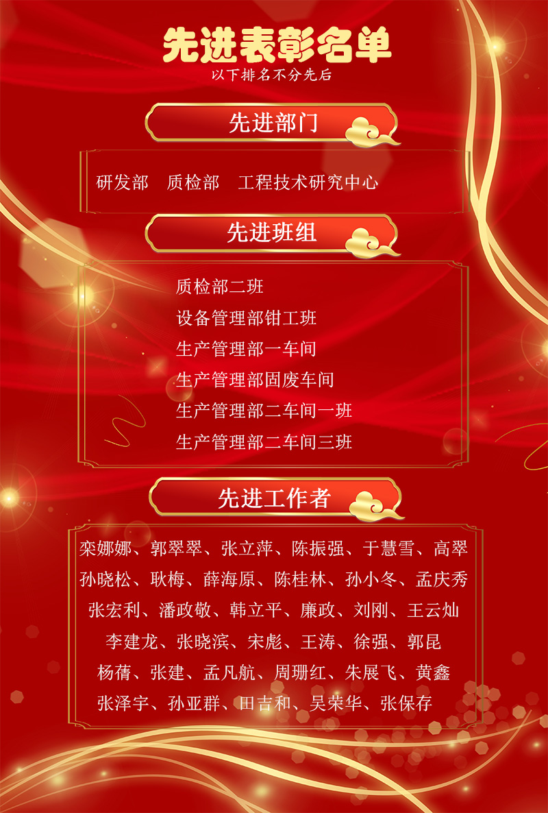 為表彰先進,樹立楷模,1月24日下午,公司2021年度先進表彰儀式在研發(fā)中心會議室隆重舉行,儀式現(xiàn)場對先進工作者、先進班組、先進部門進行表彰嘉獎。公司董事長、總經(jīng)理張新功,公司各級經(jīng)營管理干部及先進工作者、先進班組及部門代表參加了儀式。