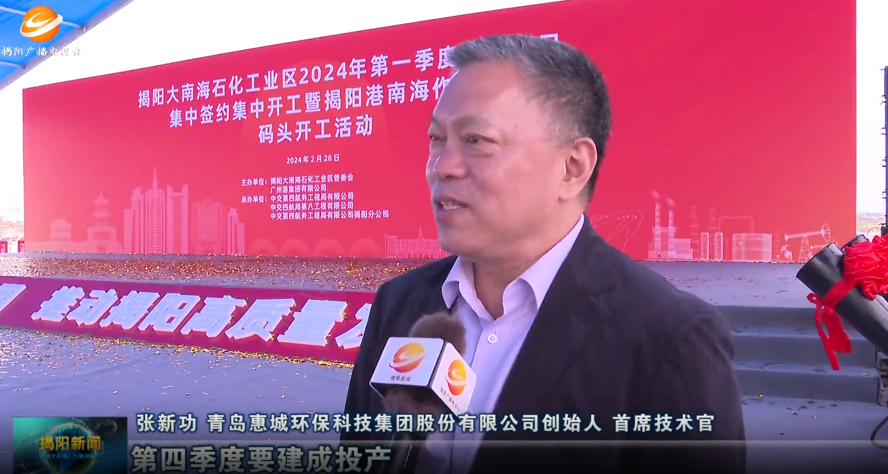 為進一步加快大南海石化產(chǎn)業(yè)的延鏈、補鏈、強鏈,為大南海高質(zhì)量發(fā)展增添蓬勃新動力,助力揭陽市發(fā)展新質(zhì)生產(chǎn)力,2月28日,揭陽大南海石化工業(yè)區(qū)舉行2024年第一季度重點項目集中簽約集中開工活動,揭陽市領(lǐng)導王勝、支光南、葛承書、蔡淡群、黃熹、李晉龍等出席開工儀式,青島惠城環(huán)保科技集團股份有限公司創(chuàng)始人、首席技術(shù)官張新功受邀參加活動。